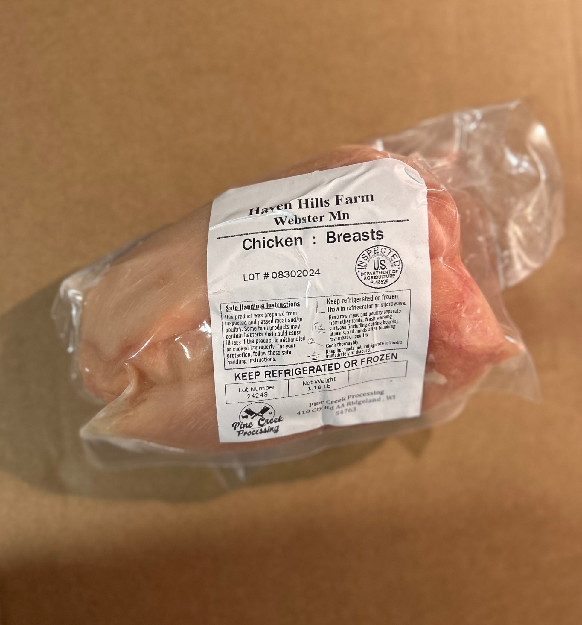 Our chickens are raised on pasture in our chicken tractors and moved to a fresh area every day. They are fed non-GMO grain from our local feed store, given as much fresh water as they can drink and any bugs and greens they find on pasture. Our chicken breasts are boneless and weigh between 1-1.5 lbs each.